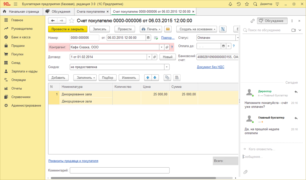 Через данный сервис коммуникация осуществляется непосредственно в окне программы 1С, которая поддерживает обсуждение, связанное с конкретными объектами — документами, отчетами, справочниками и т.д. При этом переписка полностью сохраняется и отображается вместе с объектом обсуждения.