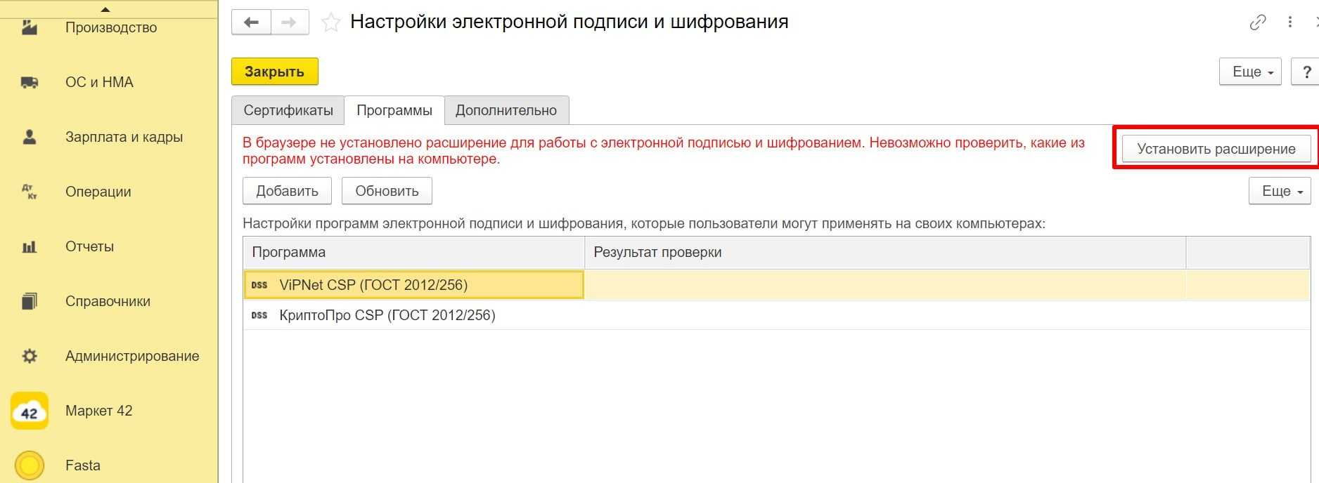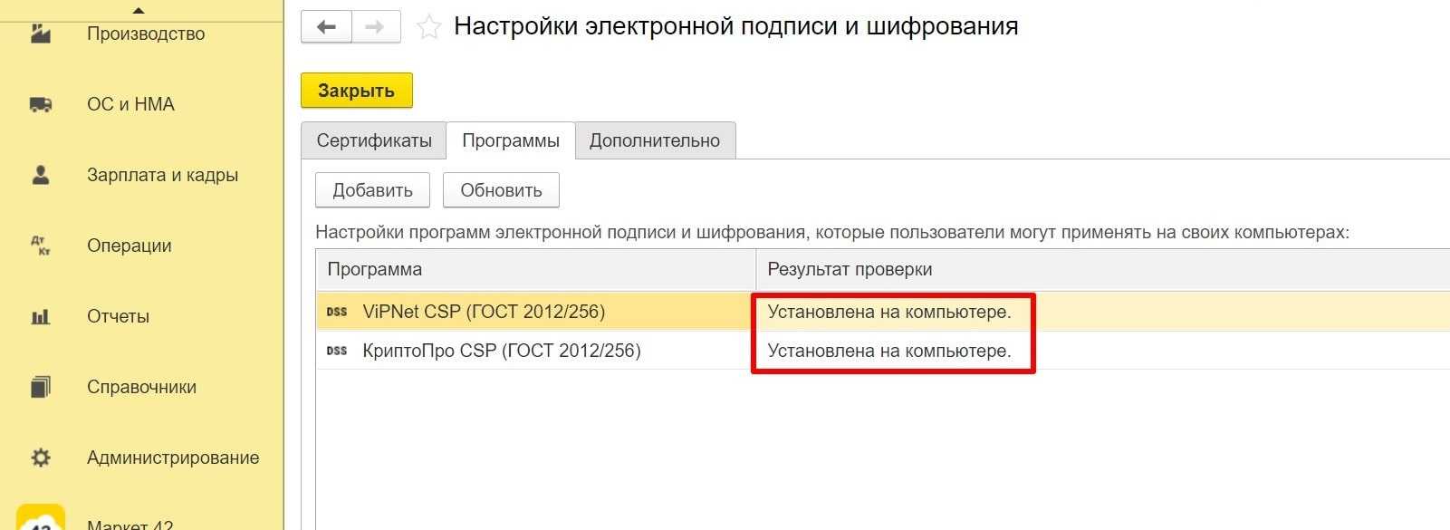 На рабочем компьютере должен быть установлен криптопровайдер (СКЗИ) — ПО для шифрования и криптозащиты данных. Софт «1С» совместим с двумя СКЗИ: КриптоПро CSP и VipNet.