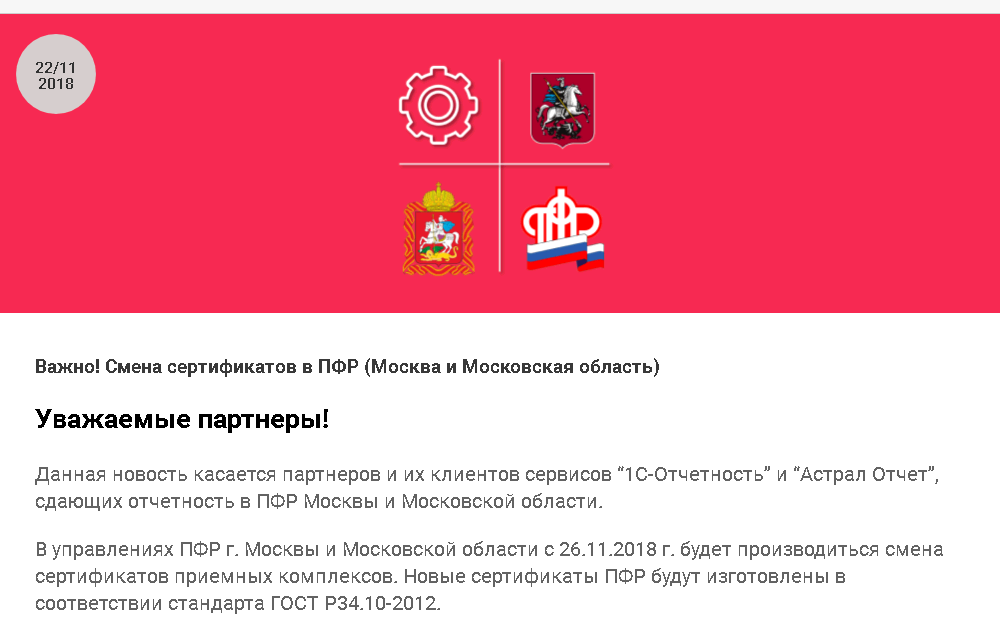 22 ноября 2018 года оператор 1С-Отчетности распространил следующую информацию для партнеров 1С и пользователей, сдающих отчетность в ПФР Москвы и Московской области.