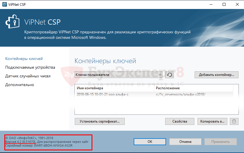 Шаг 2. Проверьте версию криптопровайдера VipNet в нижнем левом углу открывшейся формы.