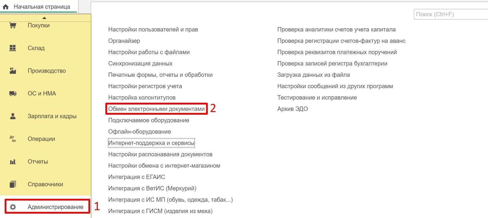 Для решения данного вопроса необходимо проверить установку расширения с 1С: Предприятием. Для этого нужно зайти на вкладку Администрирование (1), а затем Обмен электронными документами (2).