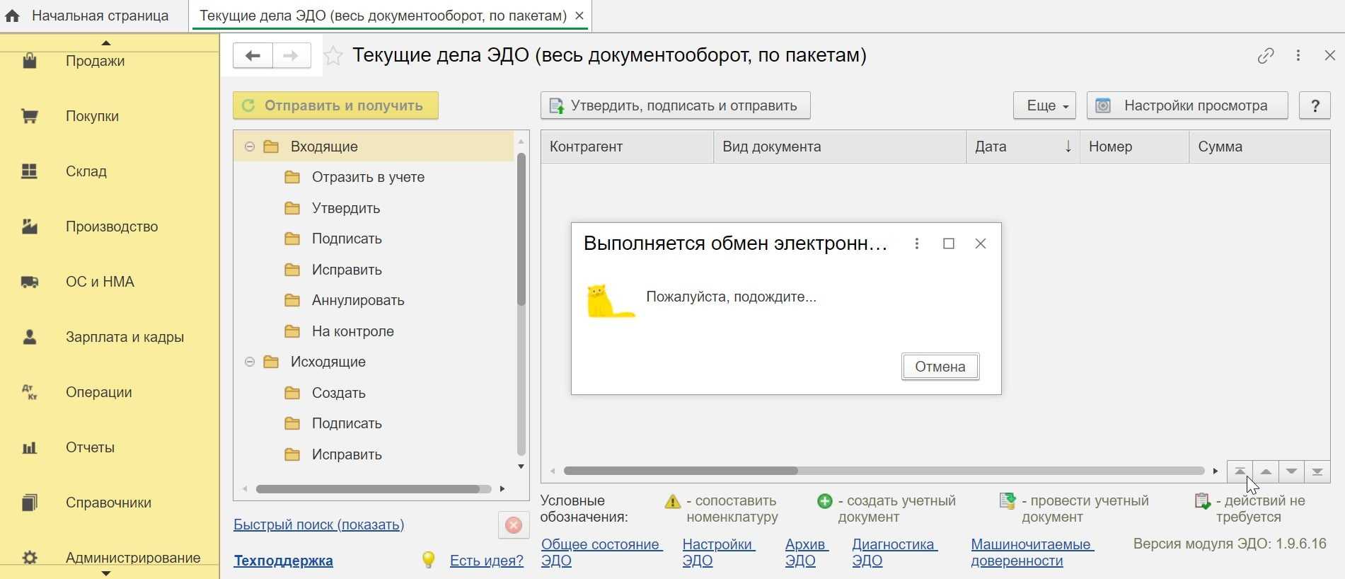 Для получения цифрового документа перейдите на страницу «Продажи» → «Текущие дела ЭДО» и нажмите «Отправить и получить». Новый документ находится в папке «Входящие».