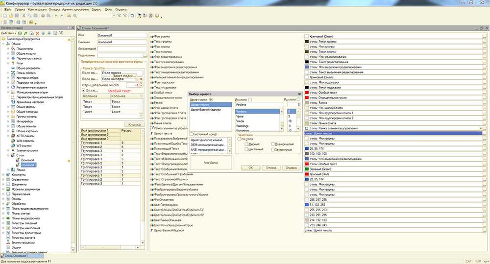 Для изменения шрифта в 1С нужно нажать Окно > Параметры > Общие > Внешний вид > Цвета и шрифты в главном меню основного окна. Затем нужно выбрать шрифт или цвет, который нужно изменить, и нажать Редактировать. Используя диалог, который открывается для выбора шрифта или цвета, можно внести необходимые изменения.
