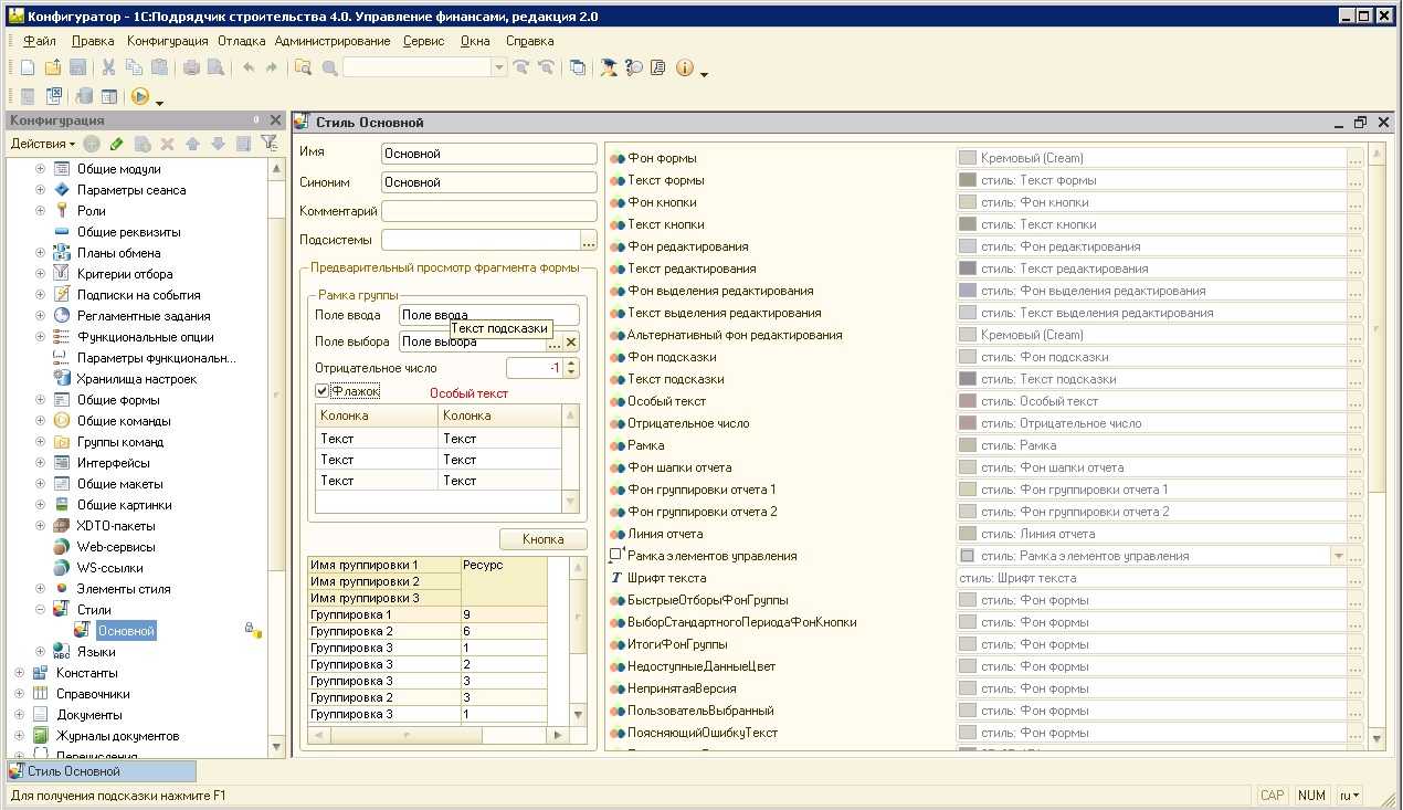 Открываем конфигурацию в режиме «Конфигуратор». Выбираем пункт «Конфигурация» и далее «Открыть конфигурацию», немного ждем до появления в правой части окна структуры базы. Спускаемся до пункта «Стили», раскрываем и выбираем «Основной» для редактирования. Далее в правой части можем полностью персонализировать оформление 1С под себя, подробно описывать процесс не будем, поскольку далее работа для опытных людей, кто понимает, но и для хацкеров несколько предупреждений: