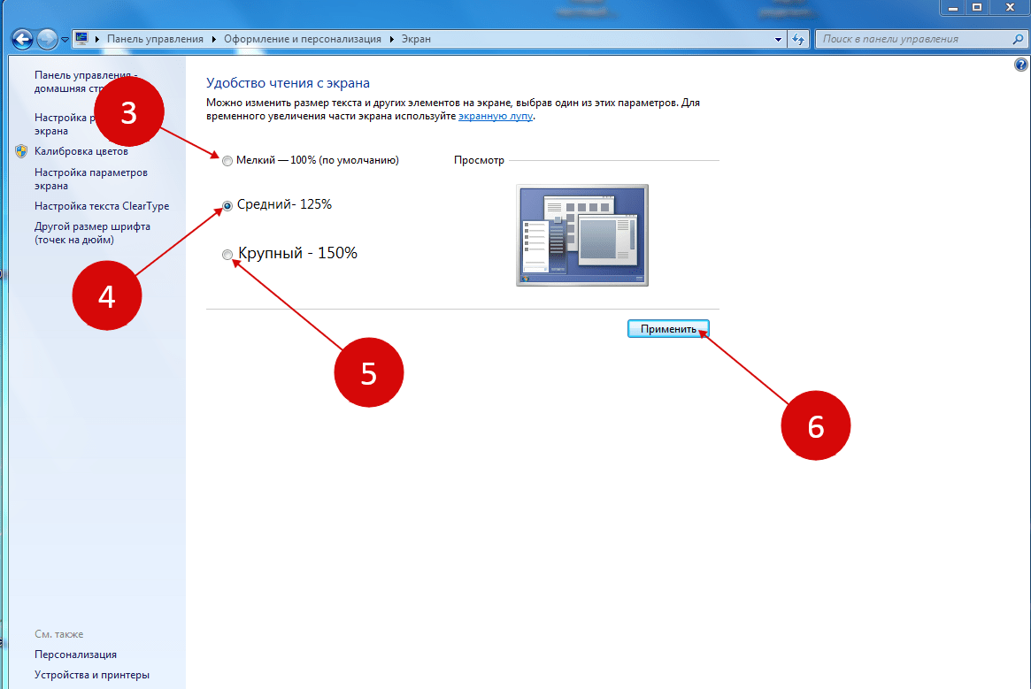 В окне настроек по умолчанию установлено значение «Мелкий» (3). Для увеличения шрифта выберете значение «Средний» (4) или «Крупный» (5). Для сохранения настройки нажмите кнопку «Применить» (6). Теперь шрифт увеличится во всех ваших программах, в том числе в 1С.