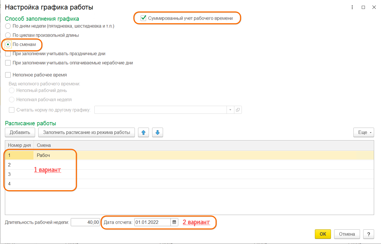 Обратите внимание, что при выборе способа заполнения По сменам строить график вы будете уже не из видов времени, а из собранных нами на предыдущем этапе готовых их наборов – рабочих смен.