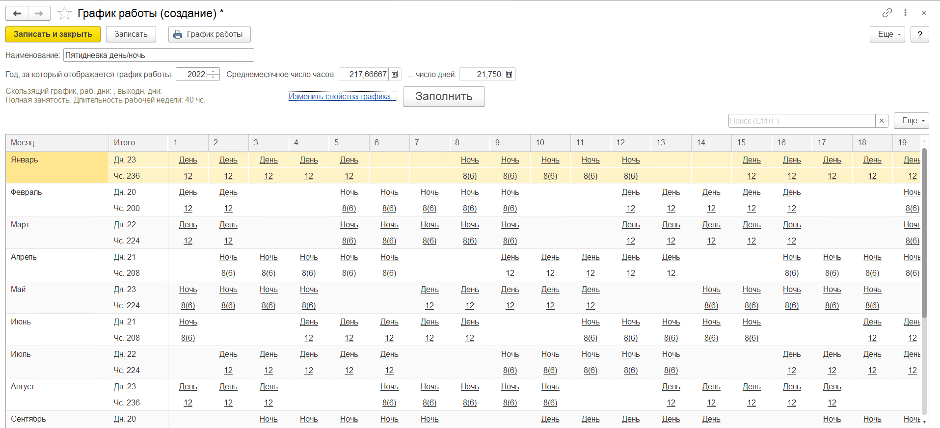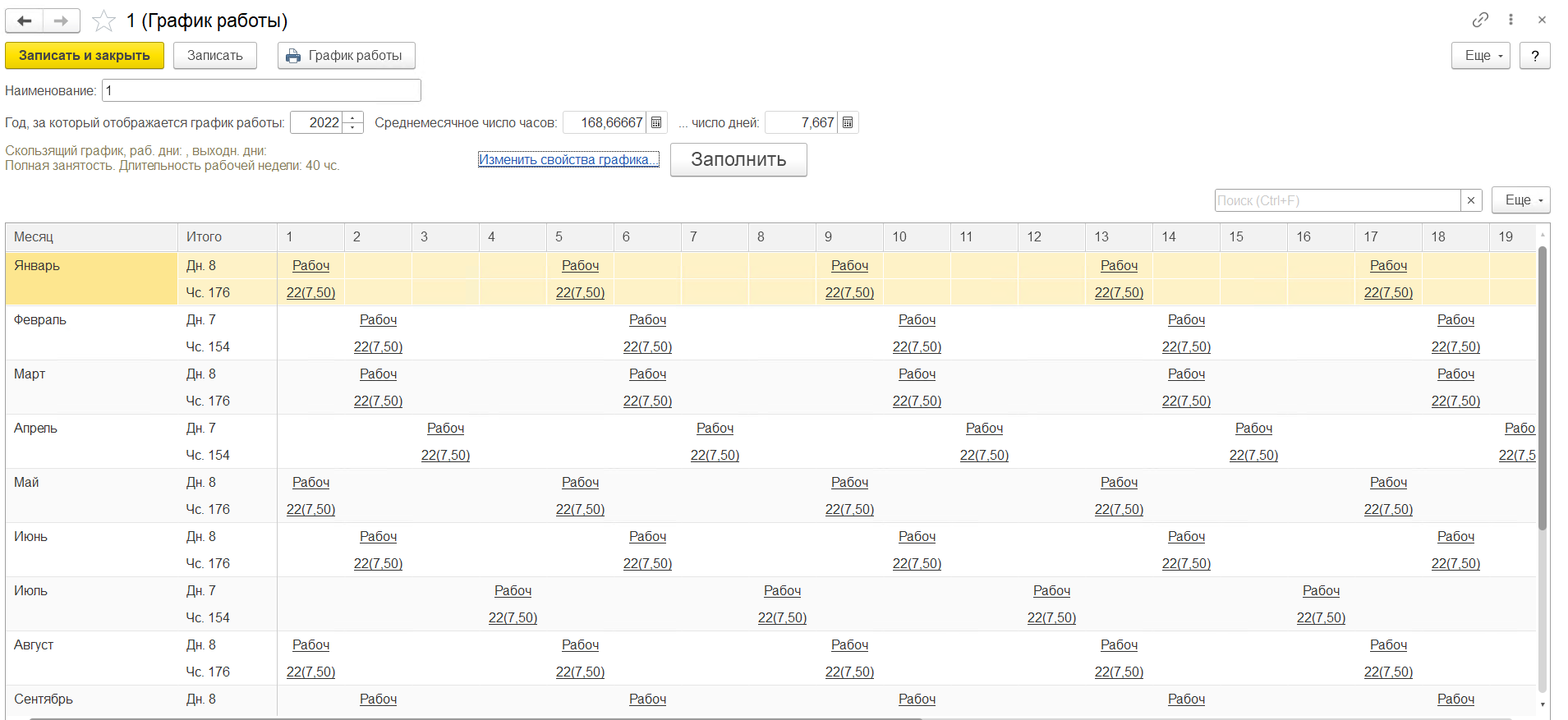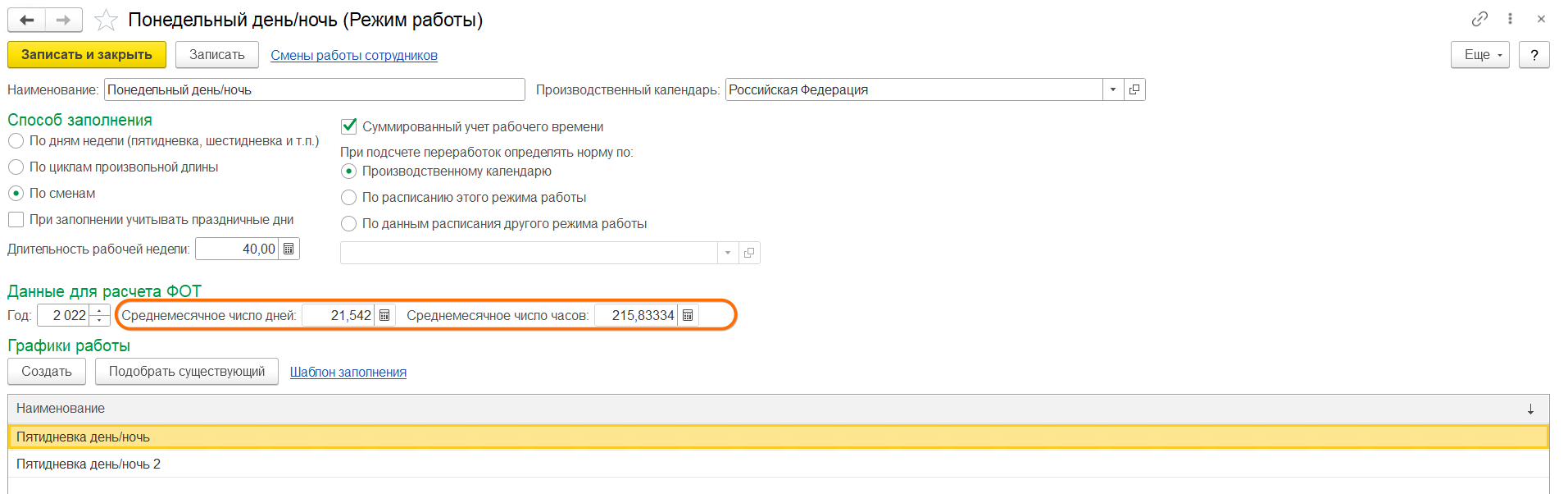 Обратите внимание, что среднемесячные количества дней/часов даны усредненными значениями по обоим графикам, и ФОТ в Штатном расписании будет рассчитан именно по этим значениям, а не по какому-то конкретному графику из набора.