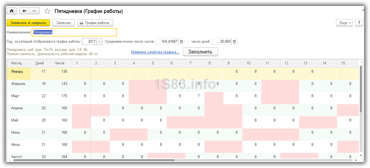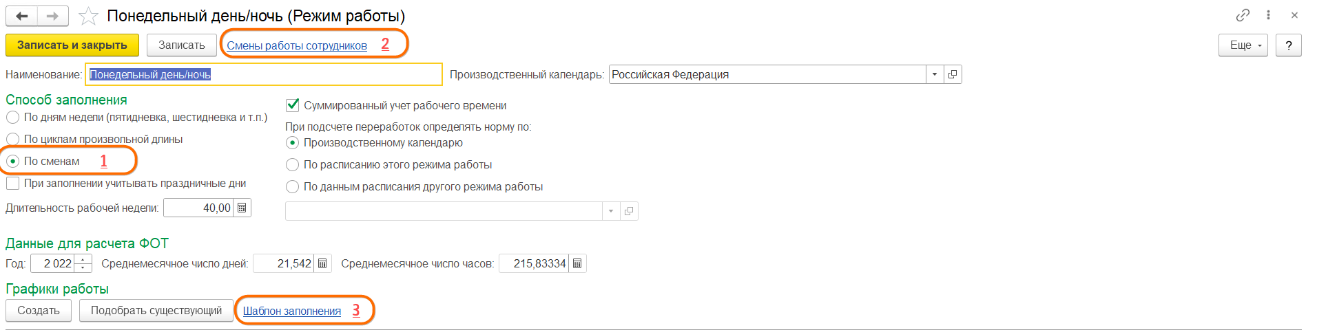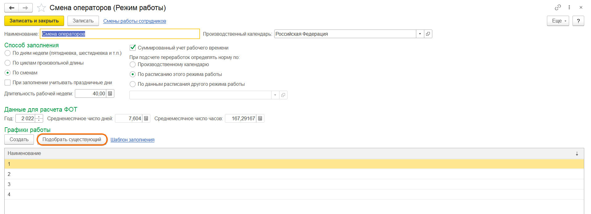Обратите внимание, что среднемесячные количества дней/часов даны усредненными значениями по обоим графикам, и ФОТ в Штатном расписании будет рассчитан именно по этим значениям, а не по какому-то конкретному графику из набора.