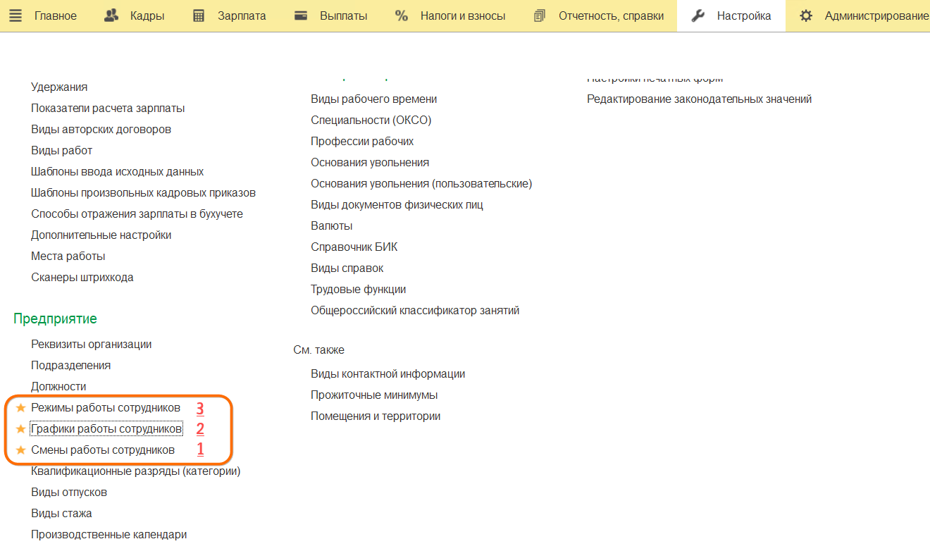 Вся работа будет выполнена в разделе Настройка, начиная с низших подчиненных элементов структуры Смены – Графики — Режимы