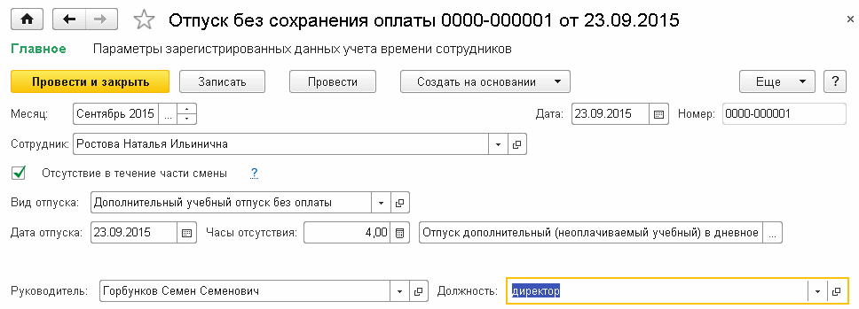23 сентября 2015 года в течение части смены (в документе установлен одноименный флаг) сотрудник четыре часа был в дополнительном учебном отпуске без оплаты, норма рабочего времени по графику — 8 часов.