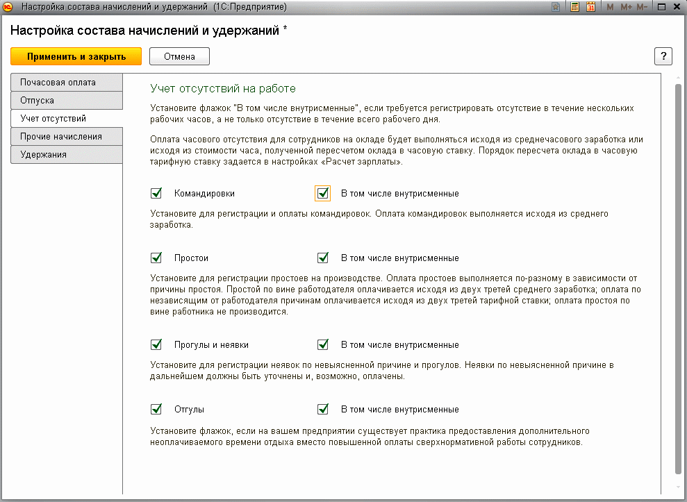 Если в процессе работы выяснится, что не все используемые в организации внутрисменные отсутствия подключены, то можно в меню Настройка -> Расчет зарплаты -> Настройка состава начислений и удержаний