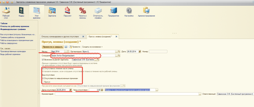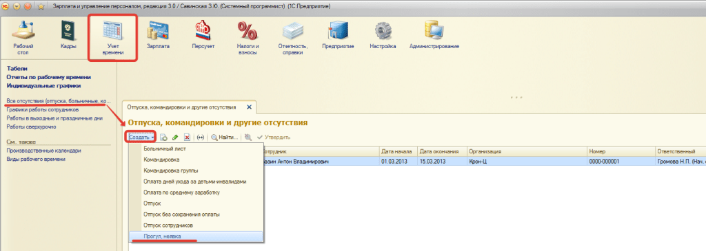 Следующий этап — ввод невыхода. Ввести его можно как , так и отдельным документом.