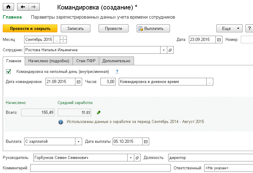 21 сентября 2015 года внутрисменная командировка сотрудника длилась 3 часа, норма рабочего времени по графику — 8 часов. При расчете зарплаты за этот день оплата по окладу автоматически начисляется за 5 часов. В табеле 21 сентября будет отмечено буквами «я/к», а время — 5/3 (рис. 7).