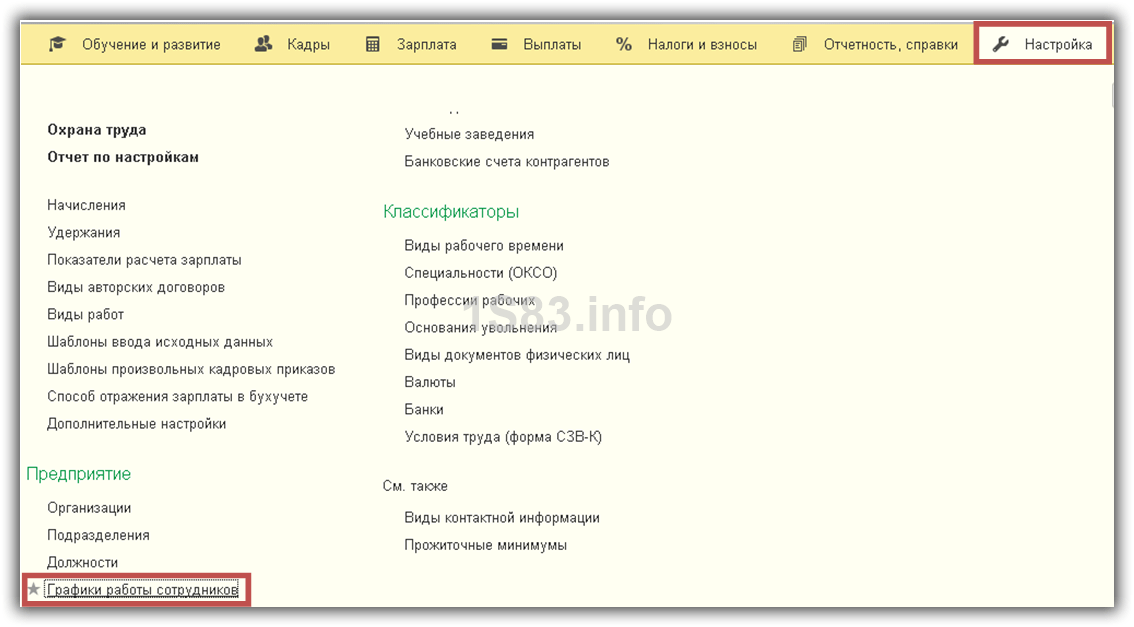 После заполнения производственно календаря в 1С ЗУП, вам необходимо создать и заполнить графики работы сотрудников. Для этого перейдите в меню «Настройка» и выберите пункт «Графики работы сотрудников».