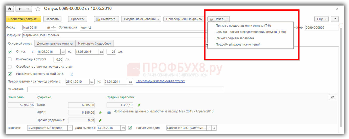 При необходимости, на основании проведенного электронного документа, бухгалтер может распечатать поручение на отпуск по форме Т-6 прямо из интерфейса. Также здесь есть возможность вывода на печать расчета среднего заработка.