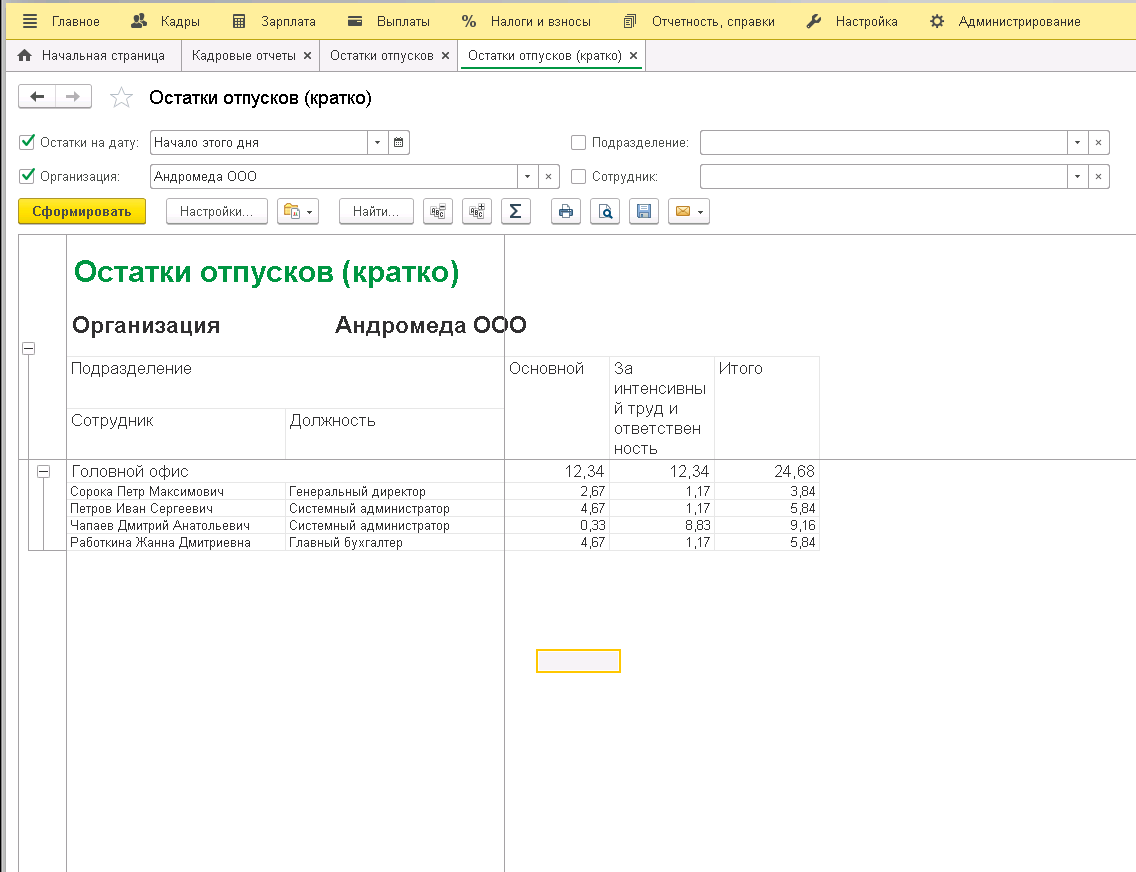 - «Остатки отпусков (кратко)» (4). Сокращенный вариант отчета.