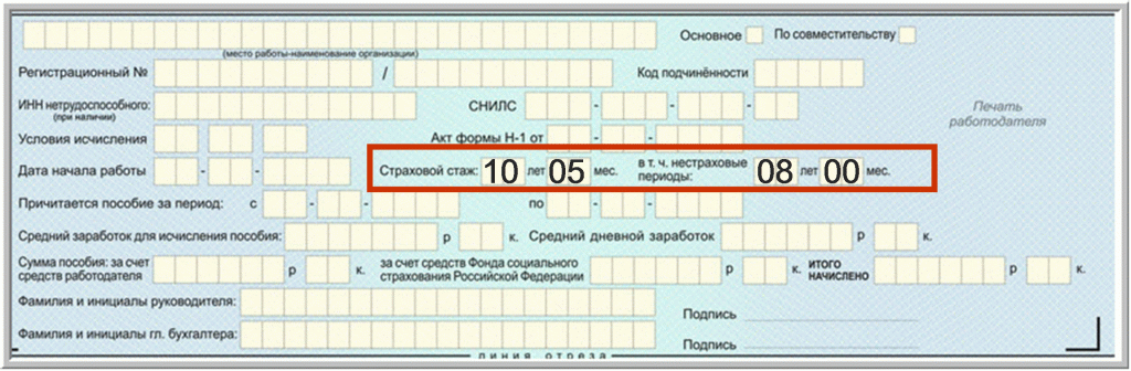 На бланке в поле «Cтраховой стаж» указывается 10 лет 5 месяцев и выделяется нестраховой период в том числе — 8 лет (рис. 1).