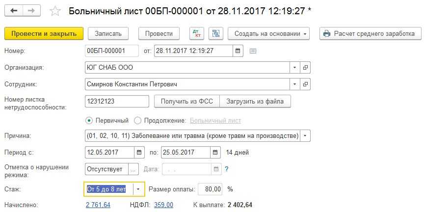 Пример 2. Заполнение данных о стаже на бланке больничного листа и в программе «1С:Зарплата и управление персоналом 8»