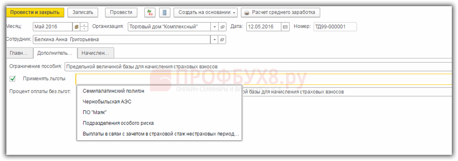 На закладке Дополнительно можно указать ограничение пособия, если такое было. А также применение льгот выбором из списка: