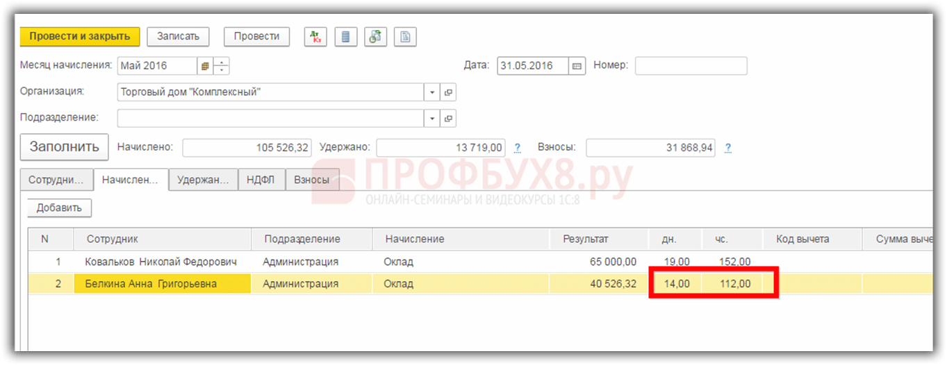 С помощью документа Больничный лист можно не только посчитать оплату пособия. Программа 1С 8.3 Бухгалтерия считает оклад с учетом отсутствия работника: