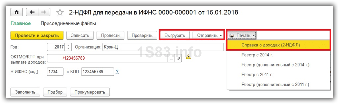 Обязательно проверьте все данные и проведите документ. В дальнейшем его можно выгрузить или сразу же отправить в контролирующий орган (если у вас соответствующе настроена программа). Так же вы можете распечатать документ, выбрав соответствующий пункт в меню «Печать».
