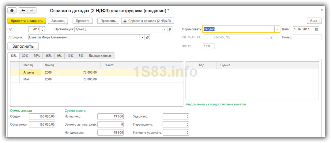 На последней вкладке расположены личные данные того работника, для которого делается данная 2-НДФЛ. Их можно отредактировать непосредственно в карточке документа. Если они будут отличаться от тех, что введены в карточке сотрудника, программа выдаст вам соответствующее предупреждение.
