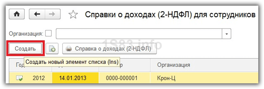 Перейдите в список документов 1С 8.3 «2-НДФЛ для сотрудников». Для каждого сотрудника на определенный год создается отдельный документ. Нажмите на кнопку «Создать».