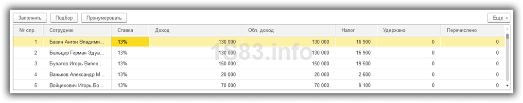 При нажатии на любую строку заполнившейся строки, для каждого сотрудника будет открыта отдельная справка 2-НДФЛ. Данный документ, по сути, является реестром справок сотрудников.