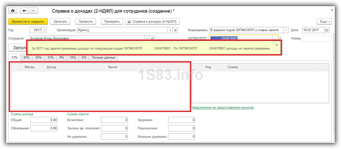 Если нажать на знак вопроса справа от поля «ОКТМО/КПП», программа уведомит вас, зарегистрированы ли доходы за данным сотрудником по выбранному коду. На рисунке выше доходы за 2017 год у Булатова Игоря Валентиновича по КПП «123456789» были зарегистрированы.