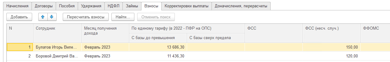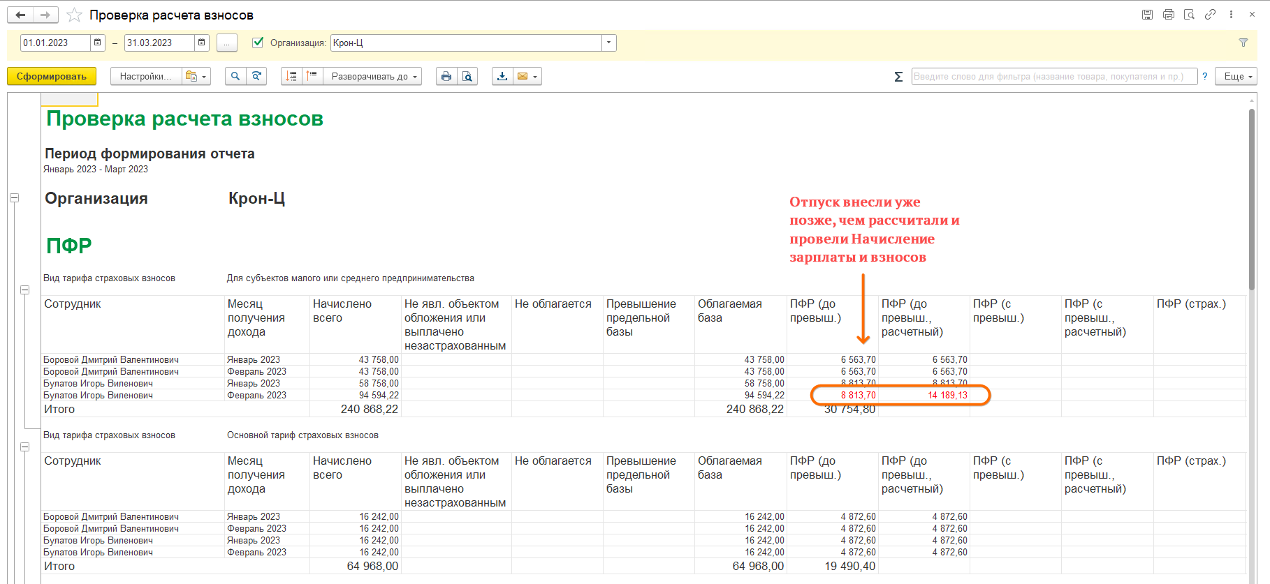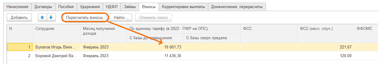 Также взносы в любом межрасчетном начислении (Отпуск, Премия и.т.д.) просто не учтутся, если оно было введено после документа Начисление зарплаты, а взносы в документе Начисление зарплаты не пересчитали.ВНИМАНИЕ! Необходимо всегда проверять, не были ли взносы этого месяца ошибочно учтены в начислениях следующих месяцев. Это недопустимо. И в этой ситуации не поможет перерасчет взносов в предшествующих месяцах.