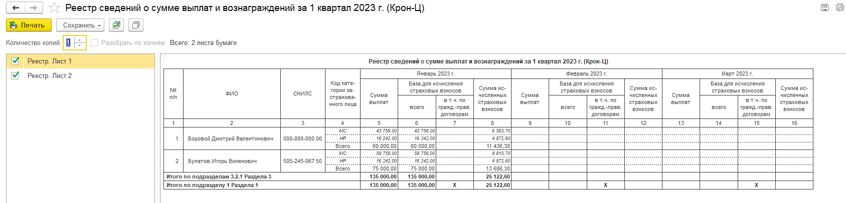 Отчет формирует информацию о суммах взносов в разрезе месяцев, сотрудников и видов страховых взносов