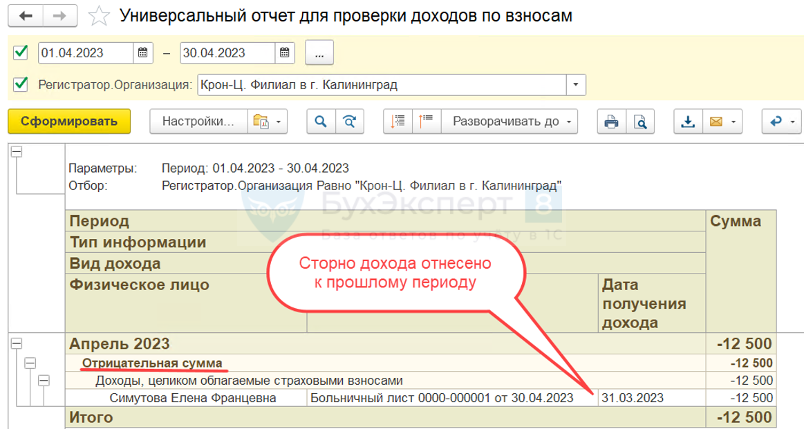 В отчет включаются только сотрудники, по которым сторно доходов в учете взносов: