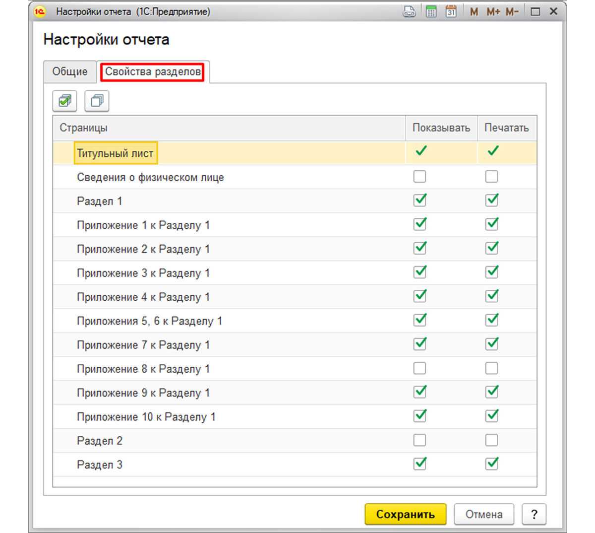 - Распечатать или выгрузить отчет РСВ в электронном виде для направления расчета по электронным каналам связи. Под настройкой состава заполнения РСВ понимается исключение из состава расчета необязательных разделов, которые не заполняются и не предоставляются, если отсутствуют соответствующие показатели. Чтобы настроить состав заполнения РСВ необходимо войти в режим просмотра всех разделов РСВ, нажать на кнопку «Еще», выбрать команду «Настройка» и на закладке «Свойства разделов» (рис.5) убрать флажки в колонках «Показывать» и «Печатать» для исключаемых разделов РСВ.