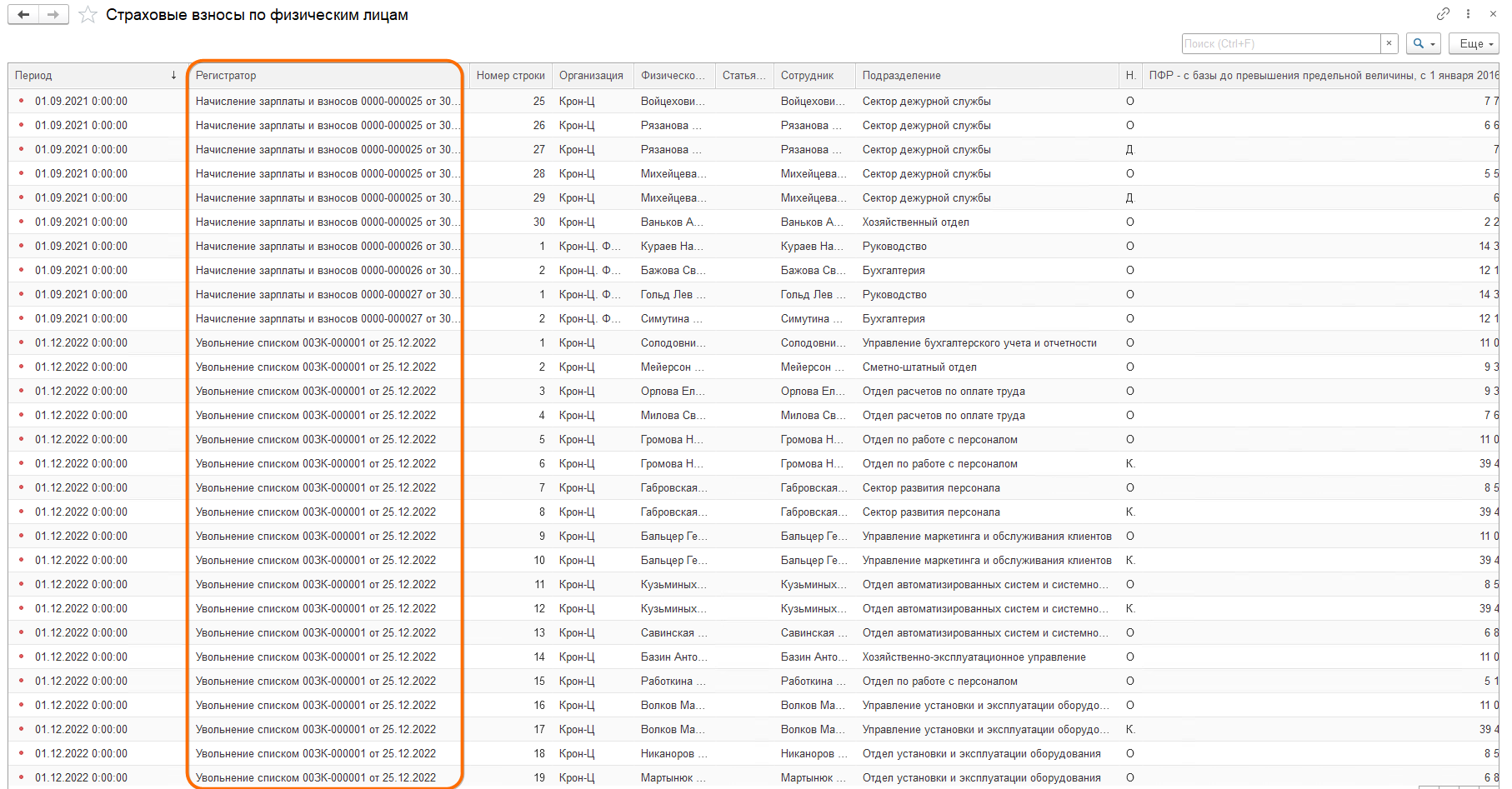 Донастроенный Универсальный отчет (Администрирование — Печатные формы, отчеты и обработки), который показывает, в какой период в учете взносов попадают перерасчеты зарплаты. Подробно о работе с отчетом — в статье Настройки универсального отчета для проверки учета взносов после перерасчетов.