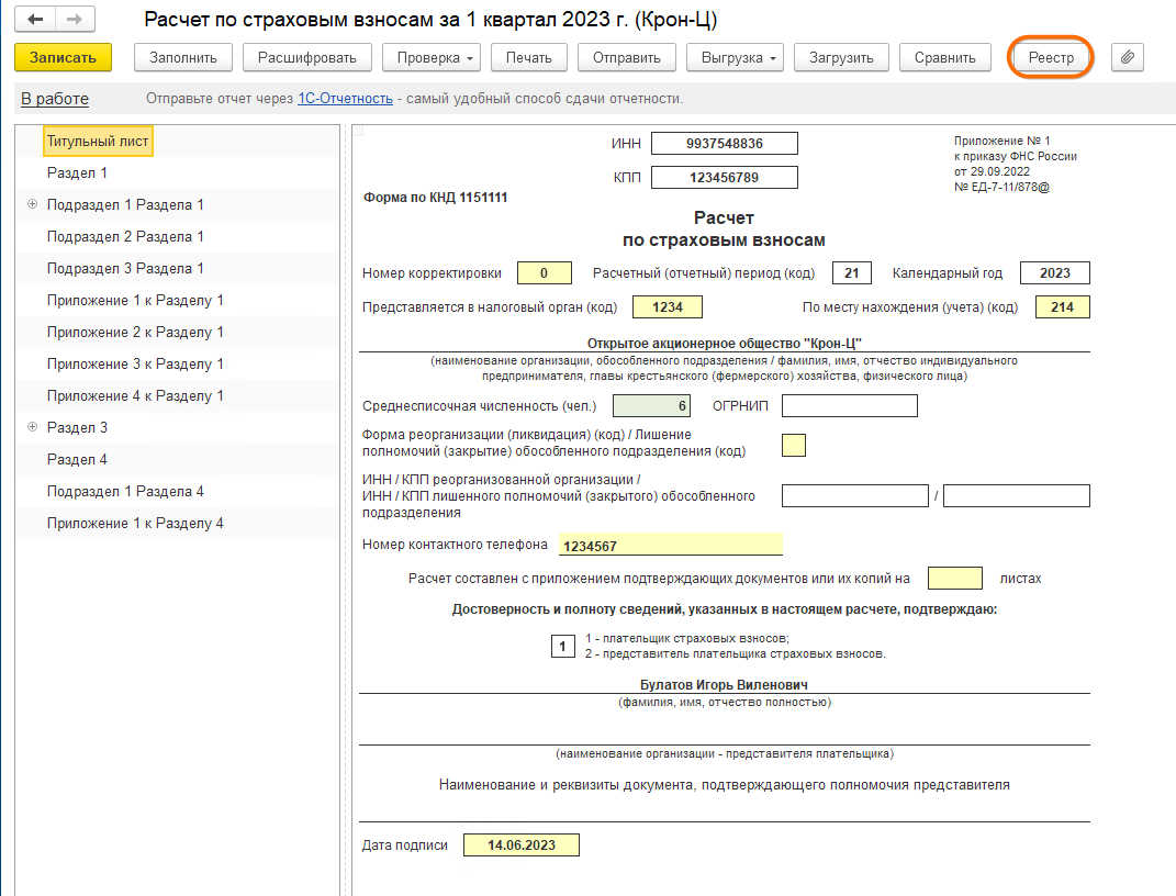 Регламентированный отчет Расчет по страховым взносам имеет удобный способ сверить суммы ПФР из Раздела 3 по сотрудникам с общей суммой Раздела 1. Это кнопка Реестр.