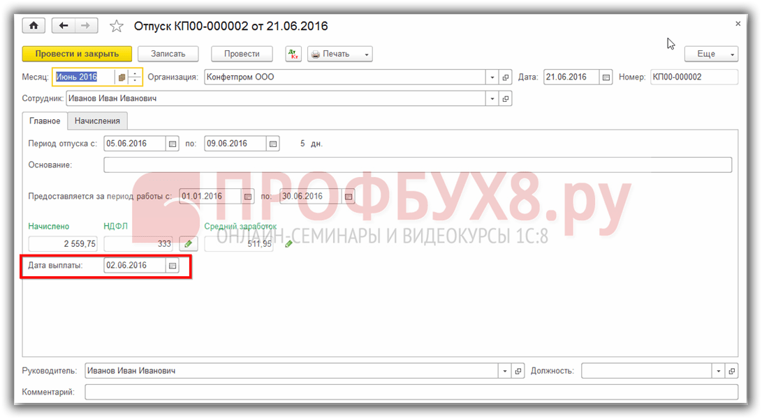 Чтобы выдать отпускные, нажмите кнопку «Выплатить» (7). Для завершения операции нажмите кнопку «Провести и закрыть» (8).