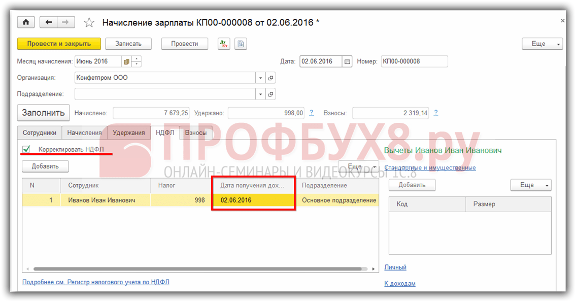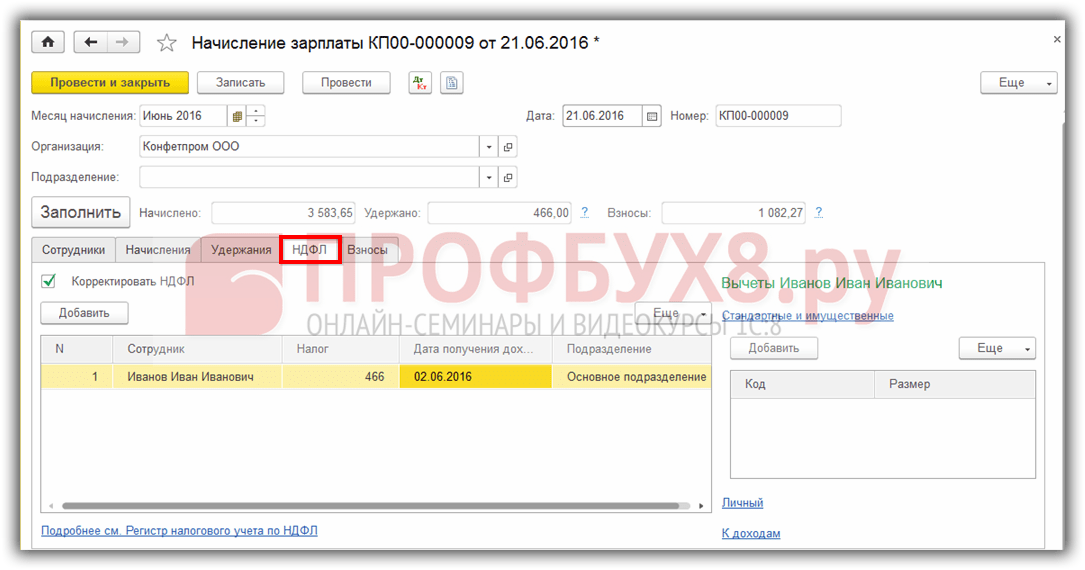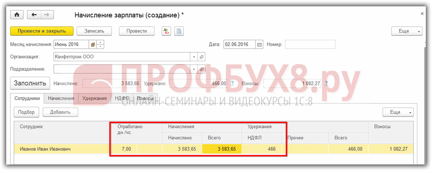В итоге проверить начисления можно в расчётном листке, а также НДФЛ в регистре налогового учёта по НДФЛ. Все эти отчёты в 1С 8.3 Бухгалтерия можно посмотреть из документа Начисление зарплаты или выбрав аналогичные ссылки в Отчётах по зарплате в разделе Зарплата и кадры.