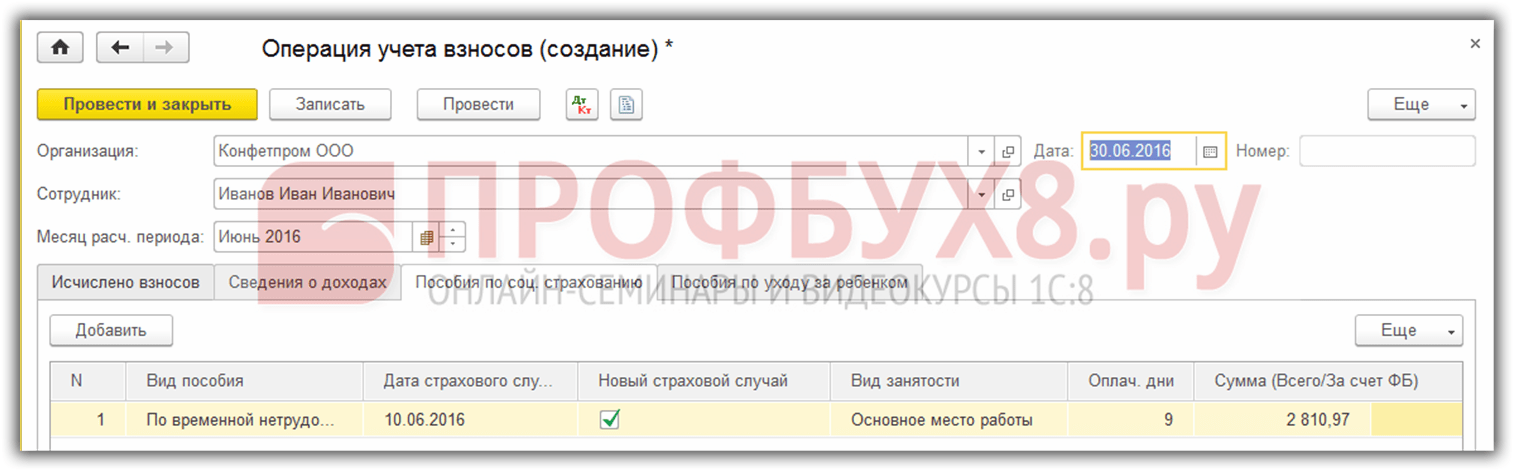 Для отражения в регламентированных отчётах больничного необходимо зарегистрировать документ Операция учёта взносов в разделе Зарплата и кадры: