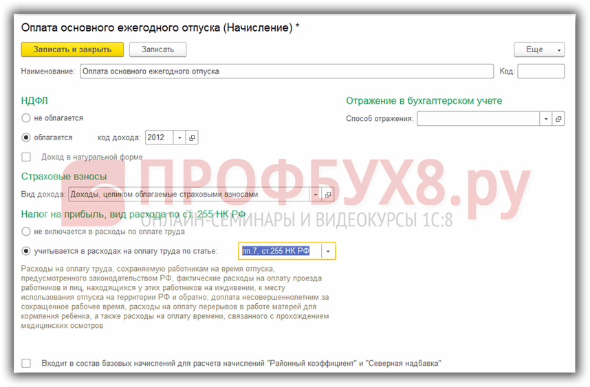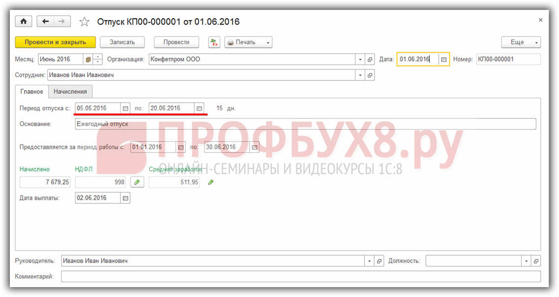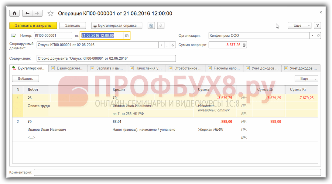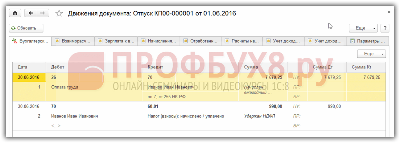 Данный документ формирует типовые проводки по начислению отпуска и отражению НДФЛ: