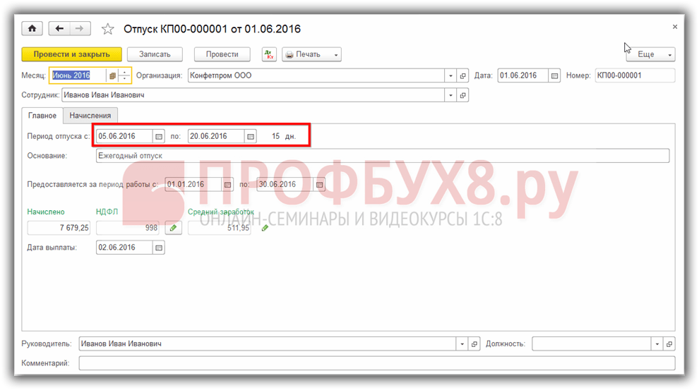 В документе необходимо отразить период отпуска и основание, а также за который период предоставляется отпуск. Более подробный расчёт начисления отображается на вкладке Начисления: