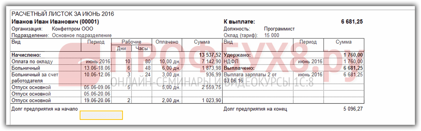 Для дополнительной проверки сформируйте расчетный листок по данному сотруднику (Зарплата / Отчеты по зарплате). В листке видно, что больничный (9) и отпуск (10) оформлены правильно, из дней отдыха вычтены дни болезни.