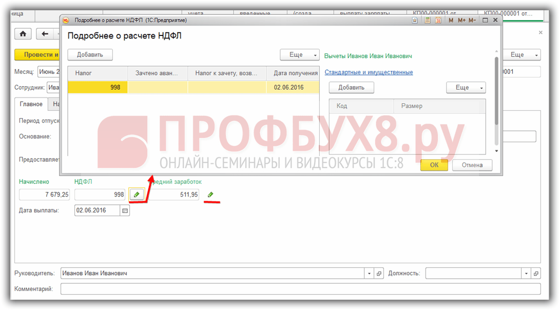 Если требуется корректировка среднего заработка или НДФЛ, то можно воспользоваться редактированием данных полей сразу из документа с помощью кнопки Редактирование: