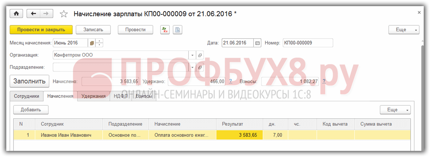 Для завершения операции, нажмите «Провести и закрыть» (8). Теперь все дни отсутствия учтены правильно, дни отдыха уменьшены исправительным документом.