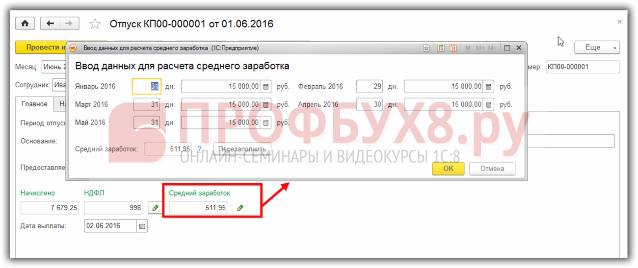 Устанавливаем новый месяц принятия расходов (апрель), проверяем, что планируемая дата выплаты осталась прежней, так как сотруднику по отпуску все уже выплачено, так же видим, что средний заработок для расчета остался неизменным.