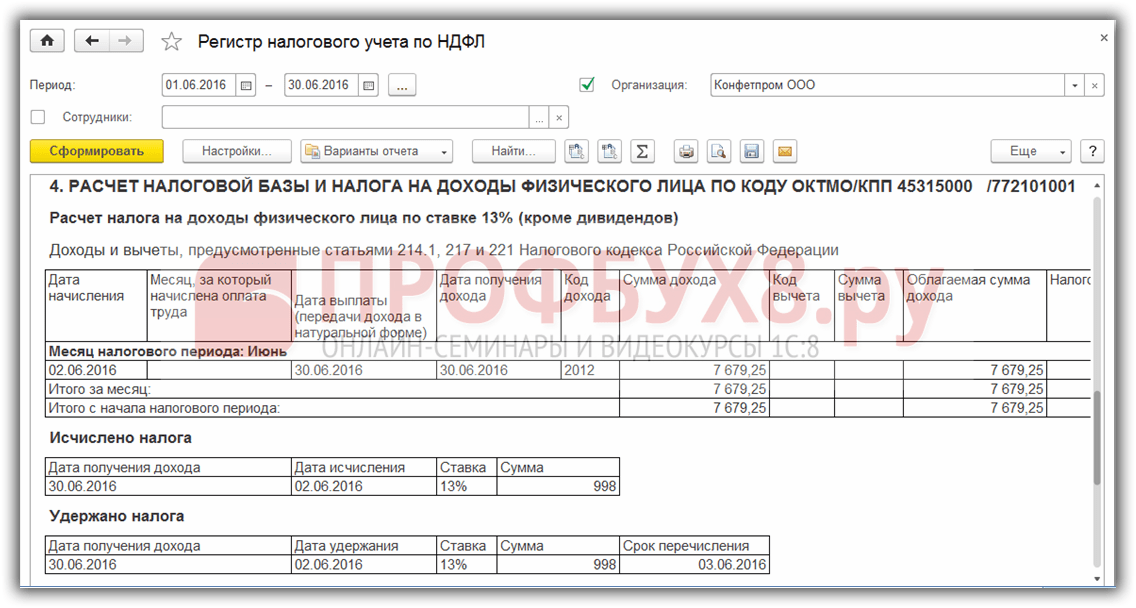 Проверим НДФЛ в регистре налогового учёта по НДФЛ: