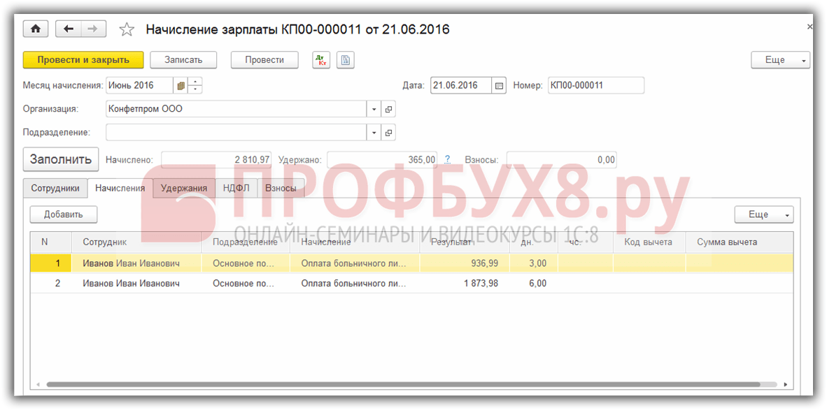 - В документе подбираем сотрудника и редактируем вручную закладку Начисления;