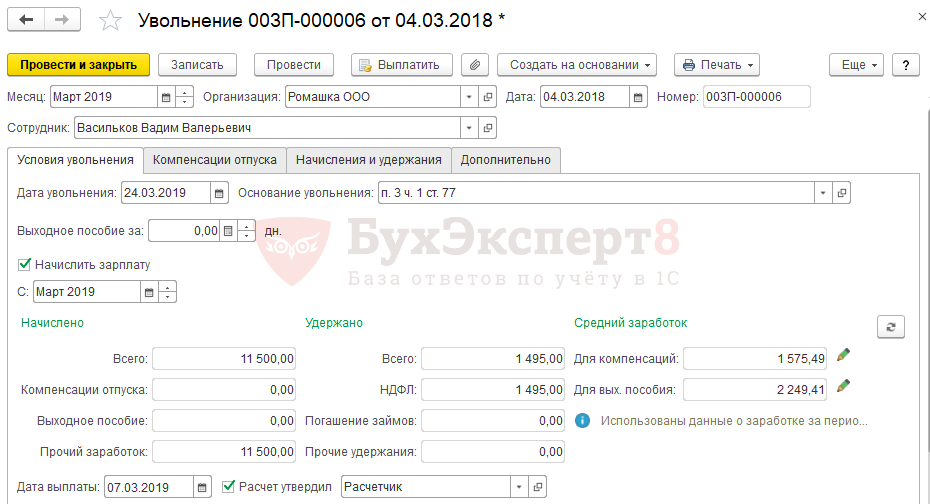 Эти данные берутся программой из проведенного вами в первом действии приказа об увольнении. Далее как оформить увольнение сотрудника в 1С. Следующий шаг.