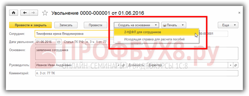 Созданную ведомость можно найти в списке всех выплат сотрудникам. И еще один очень удобный для бухгалтера момент – это возможность создать справку 2-НДФЛ и справку для расчета пособий из документа Увольнение. Для этого надо воспользоваться функционалом Создать на основании и сформировать необходимые при увольнении сотрудника справки.