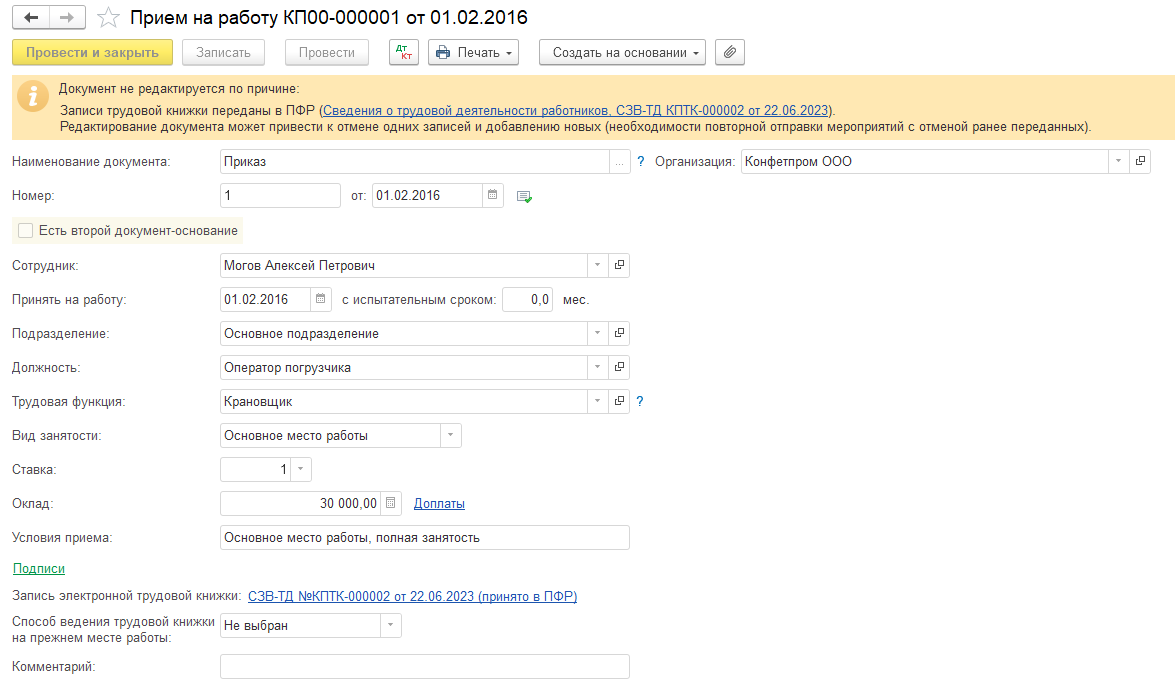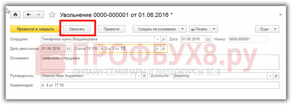 Сохранить без проведения документ можно по кнопке Записать, в таком случае в 1С 8.3 Бухгалтерия 3.0 будет зарегистрирован номер приказа, но не будет зафиксирована информация об увольнении, то есть сотрудник будет считаться работающим: