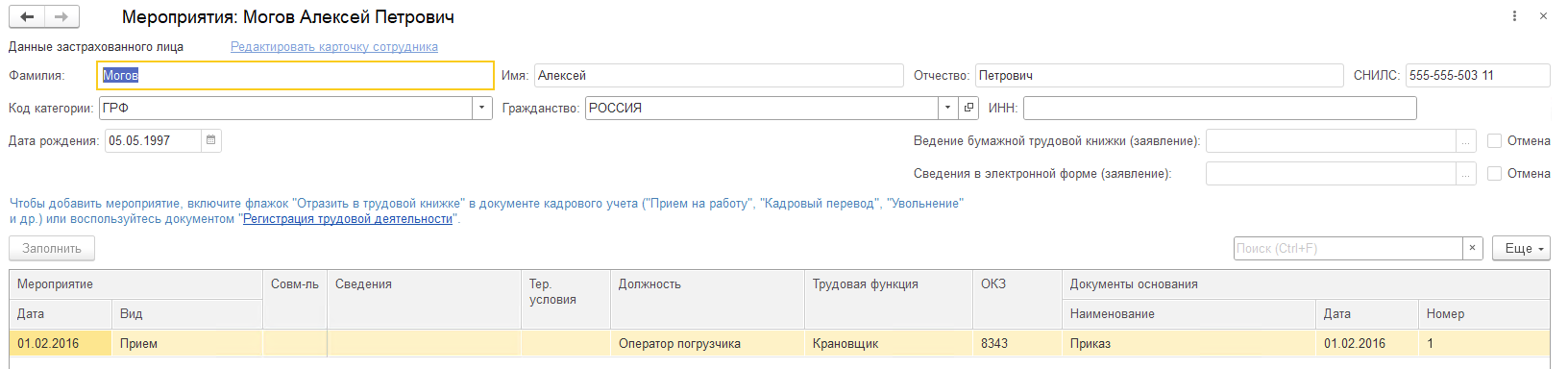 o в колонке Мероприятие – дата приема сотрудника на работу и вид мероприятия Прием